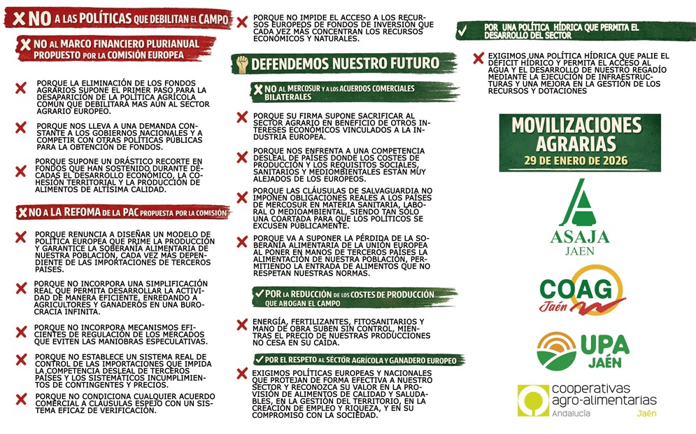 • COAG, Asaja, UPA y Cooperativas Agro-Alimentarias, en unidad de acción, convocan la protesta contra Mercosur, los acuerdos comerciales bilaterales, los recortes a la PAC y el escaso respaldo institucional para solucionar los problemas de la mano de obra, los costes y la burocracia y para defender el futuro de la alimentación el próximo 29 de enero.