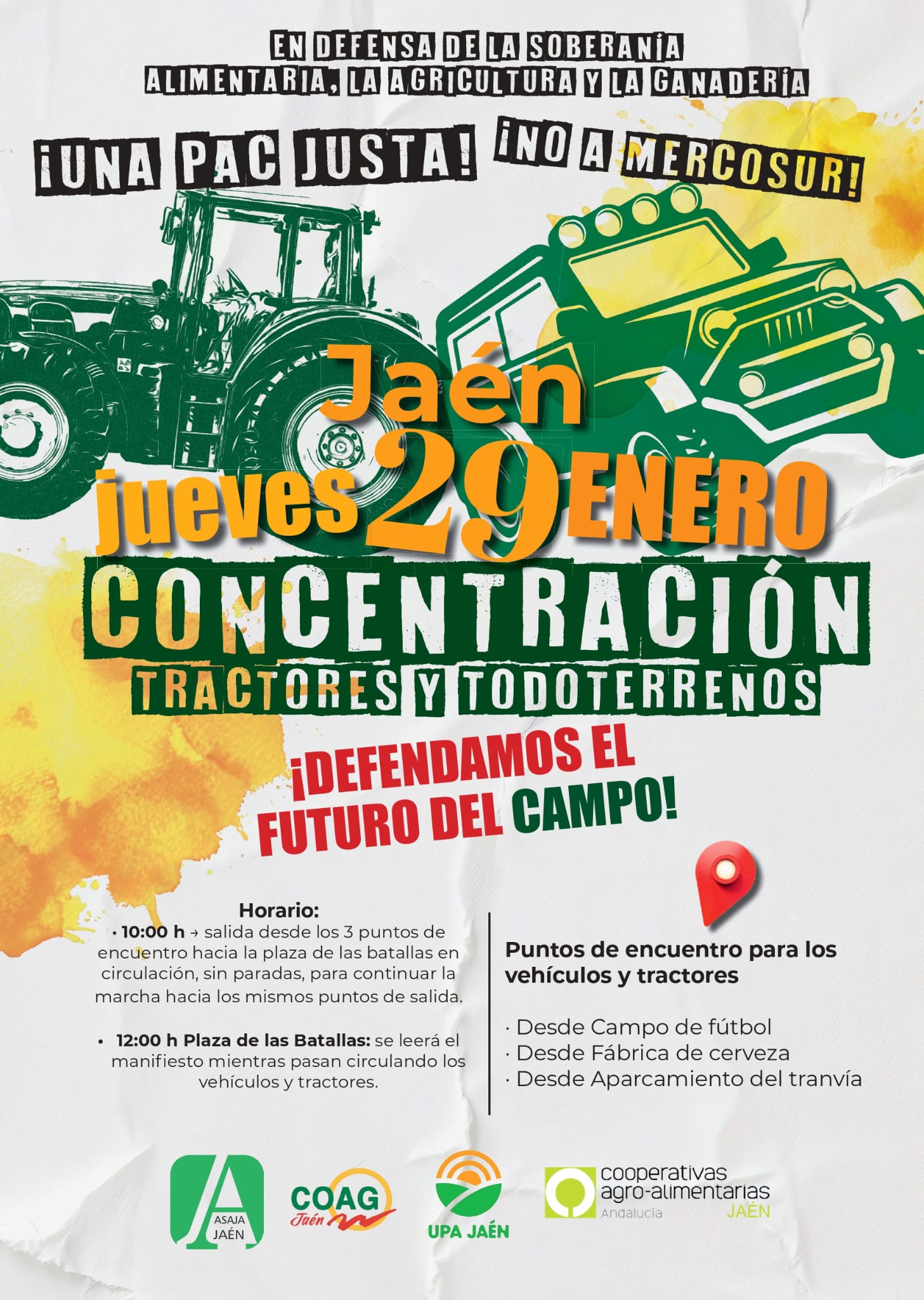 Jaén, 16 de enero de 2026.- Las organizaciones agrarias COAG, ASAJA, UPA y Cooperativas Agro-Alimentarias de Jaén han hecho un llamamiento a agricultores, ganaderos y a la sociedad en general para que se sumen a la Concentración de Tractores y Todoterrenos que, secundando las protestas convocadas a nivel nacional, se celebrará el próximo 29 de enero, ante la subdelegación del Gobierno de Jaén.